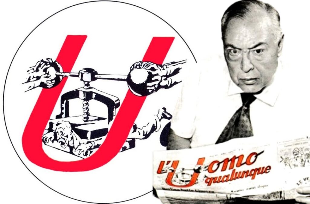 Il Fronte dell’uomo qualunque fu un giornale satirico e poi un movimento politico fondato nel 1946 dal giornalista Guglielmo Giannini. Il simbolo era un torchio che schiaccia un uomo: è il simbolo della classe politica che opprime il borghese, l’uomo qualunque. Il movimento esaltava il singolo individuo e il suo lavoro, la famiglia, la proprietà, l’ordine e la legge. Lo slogan era scurrile: «Ciò che noi chiediamo, noi gente, noi Folla, noi enorme maggioranza della Comunità, noi padroni della Comunità e dello Stato è che nessuno ci rompa più i coglioni». Un paese felice è quindi quello che non è costretto a occuparsi del proprio governo, nel quale lo stato si limita all’amministrazione lasciando che i cittadini godano della maggiore libertà civile. Senza i «politici professionali che vivono rompendo i coglioni alla gente, di nient’altro preoccupandosi se non degli stipendi e delle prebende che con quella rottura di coglioni riescono a estorcere».
