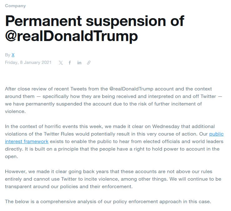 Jack Dorsey, fondatore della piattaforma, obiettò che bloccare un leader eletto o rimuovere i suoi tweet controversi avrebbe nascosto informazioni importanti che le persone dovrebbero poter vedere e discutere: i leader eletti giocano un ruolo critico nella conversazione pubblica globale e che i loro tweet, anche se controversi, sono parte integrante del dibattito pubblico. La situazione cambiò radicalmente dopo l’assalto al Campidoglio degli Stati Uniti il 6 gennaio 2021. Due giorni dopo, l’8 gennaio, Twitter sospese permanentemente l’account di Trump, temendo il rischio di ulteriore incitamento alla violenza.