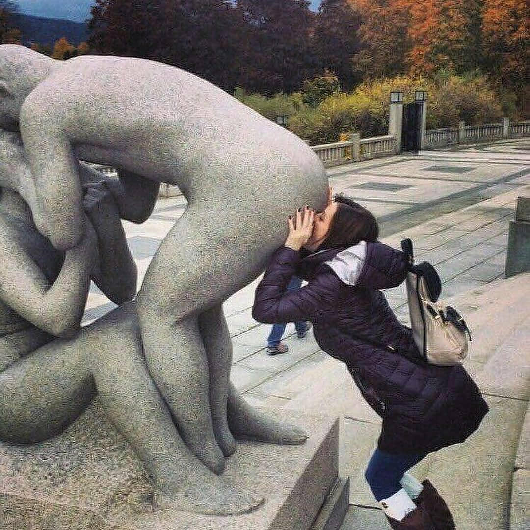Posa scherzosa al Parco Vigeland, nel centro di Oslo, Norvegia.