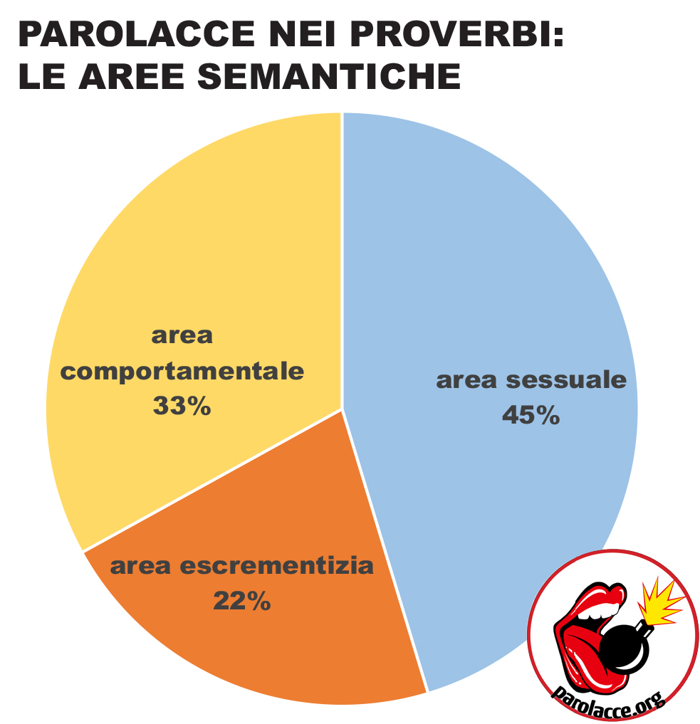 A livello semantico, a che categorie appartengono le 37 parolacce presenti? La maggioranza (45%) attinge a termini osceni dell’anatomia sessuale; seguono l’area comportamentale (33%) e quella escrementizia (22%). Un risultato che non sorprende, visto che la maggioranza delle parolacce attinge proprio dalla sfera sessuale la propria potenza espressiva. Rispetto al linguaggio parlato nella vita di tutti giorni, tuttavia, nei proverbi c’è un ricorso doppio ai termini escrementizi (servono per rafforzare gli aspetti negativi da cui i proverbi vogliono mettere in guardia) e triplo agli insulti comportamentali (stigmatizzati dai proverbi).