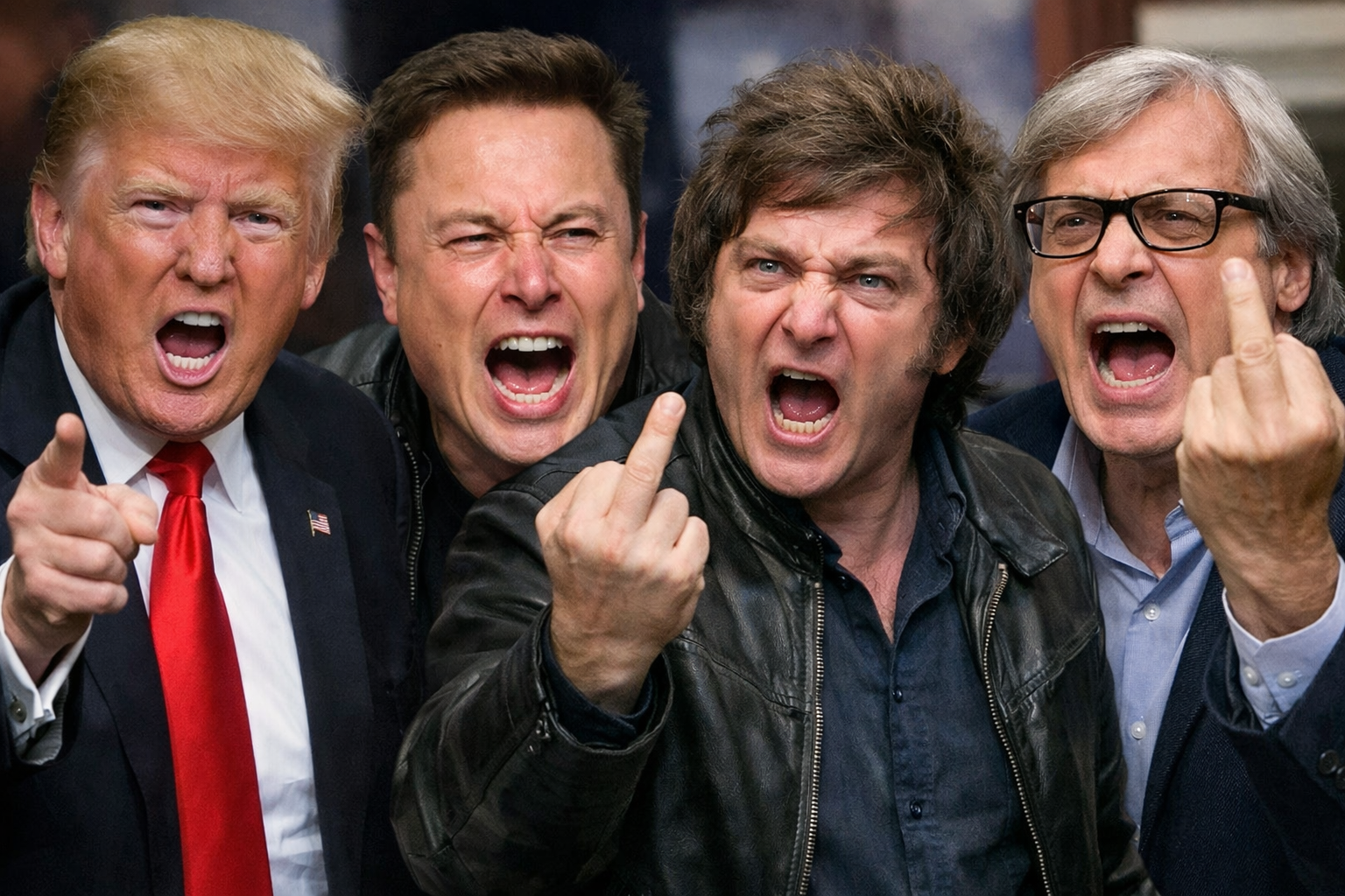 Nel fotomontaggio, da sinistra i politici che ricorrono spesso agli insulti: Donald Trump, Elon Musk, Xavier Milei e Vittorio Sgarbi.
