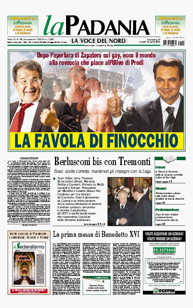 Prima pagina de La Padania, 25 Aprile 2005: un esempio di dibattito polarizzato.