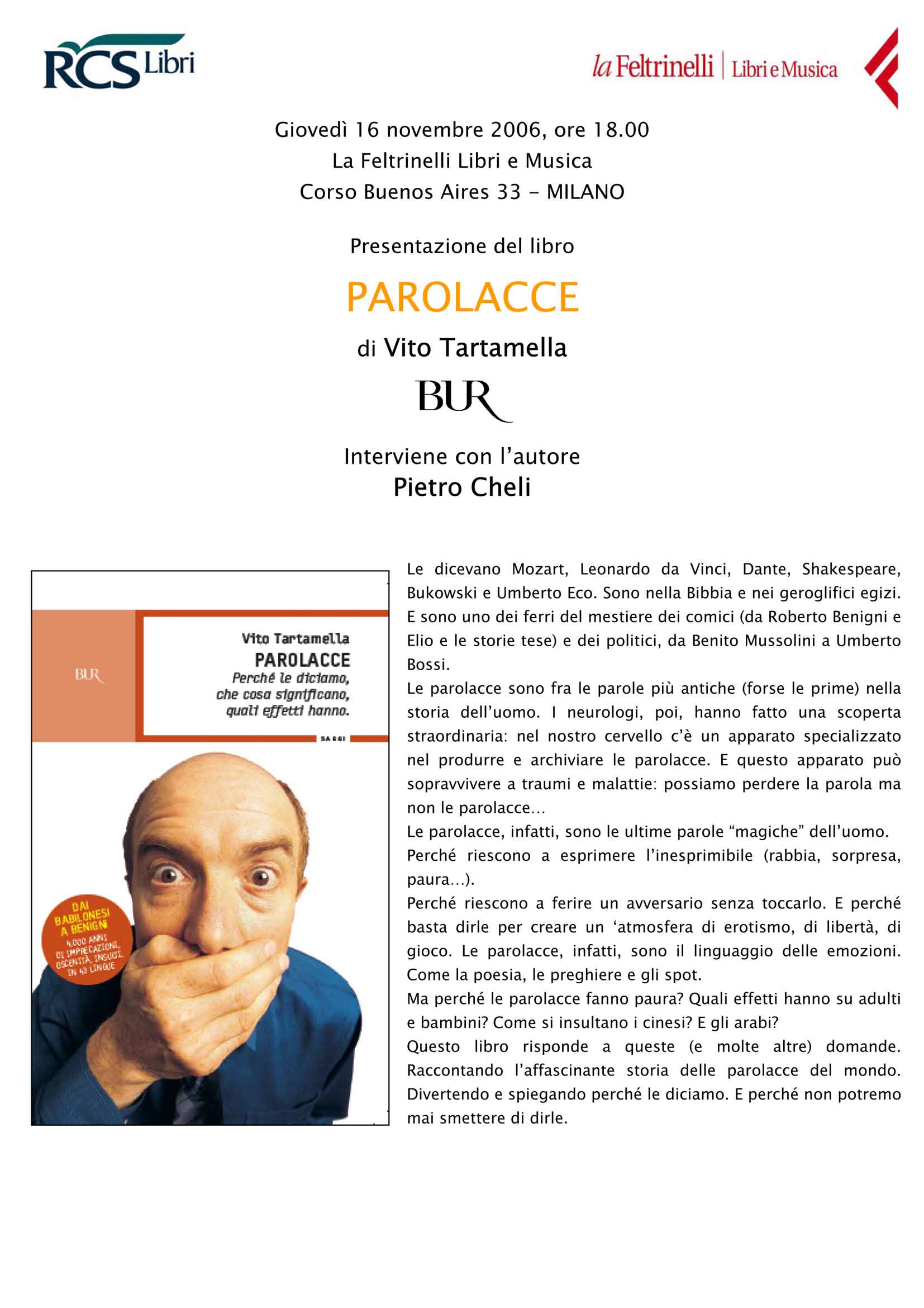 MILANO – Alla libreria Feltrinelli di Milano (corso Buenos Aires, 33, ore 18) presento il mio libro “Parolacce” (BUR) con l’intervento del giornalista e scrittore Pietro Cheli. Qui a lato, la locandina con l’invito all’evento.