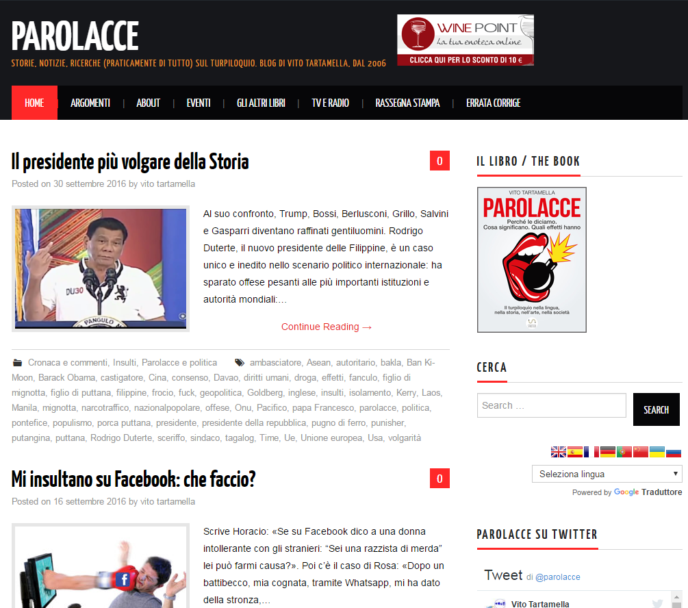 MILANO – Il sito Parolacce.org Il sito di “Parolacce” entra al 77° posto nella Top 100 mondiale della classifica generale dei siti di linguistica “Language lovers 2016“, e si piazza anche nella Top 25 dei blog professionali di linguistica. La competizione, chiamata TLL (Top language lovers) è organizzata dal 2009 dai portali di lingua Bab.la e Lexiophiles.