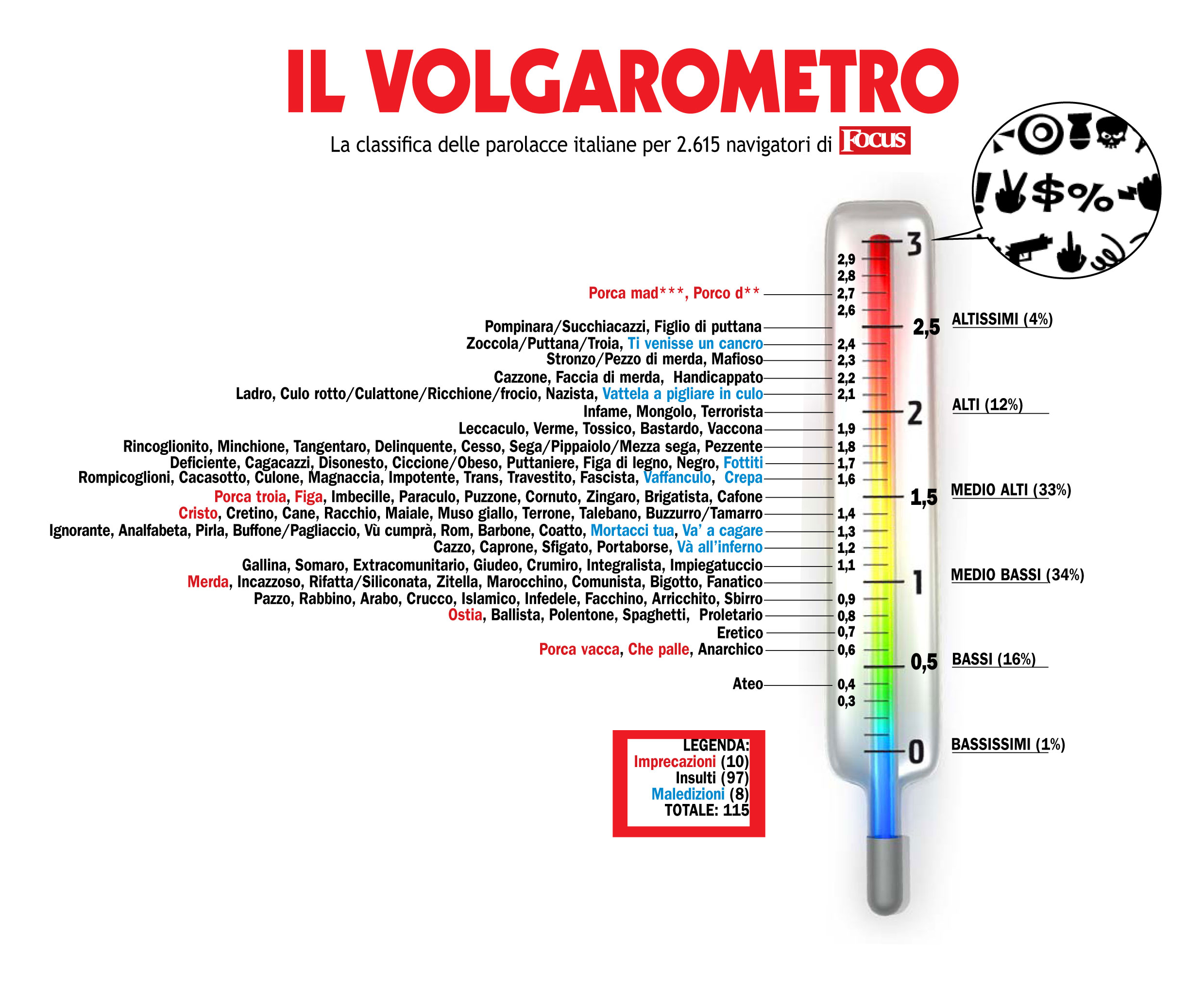 MILANO – Lancio il “Volgarometro”, la prima indagine sulla percezione di offensività di 301 parolacce italiane, valutate col metodo del differenziale semantico. Al sondaggio rispondono oltre 2.600 persone di tutta Italia.