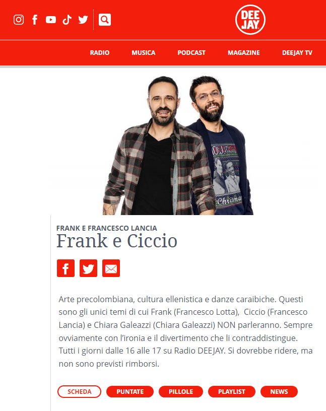 MILANO – Improvvisata di Radio Deejay, che mi invita al programma Frank e Ciccio per un intervento sulla storia delle parolacce durante il loro programma pomeridiano.
