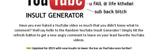 Random-YouTube-Insult-Generator-594×198 Published 1 Marzo 2014 at 594 × 198 in Random-YouTube-Insult-Generator-594×198 Previous Next